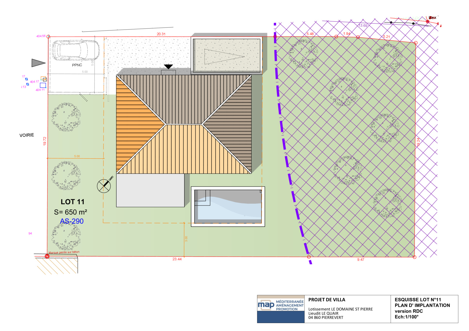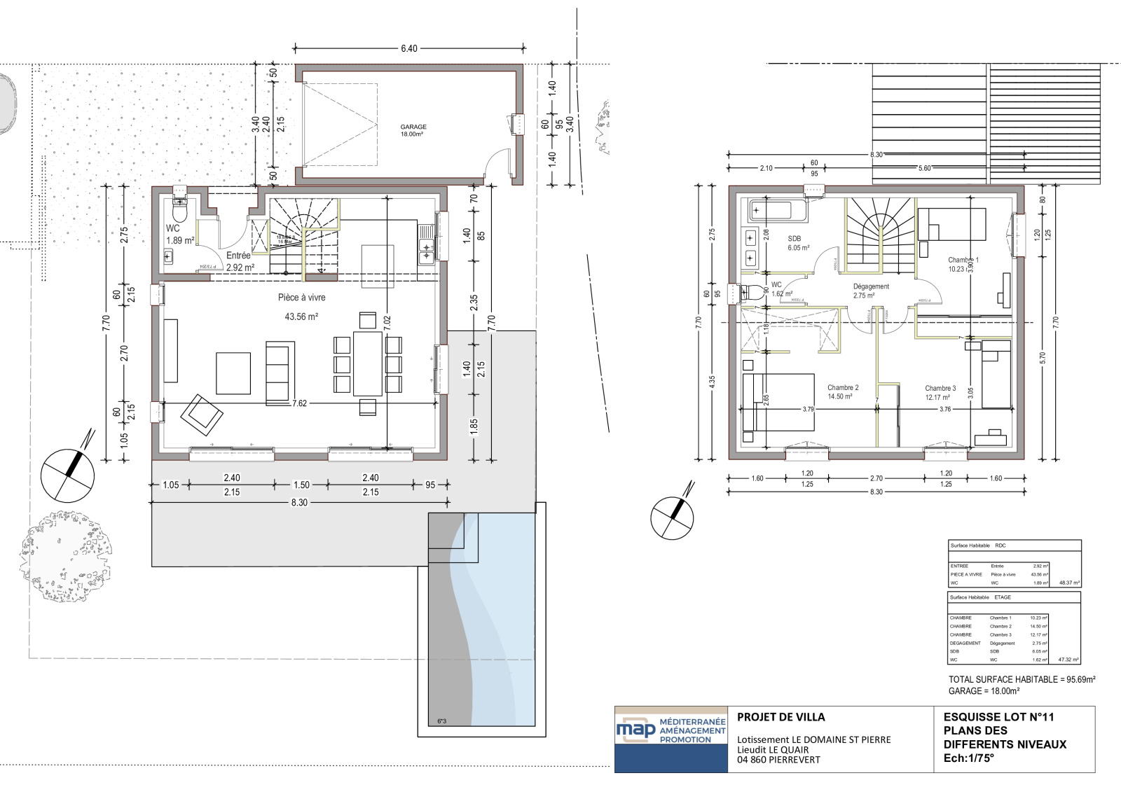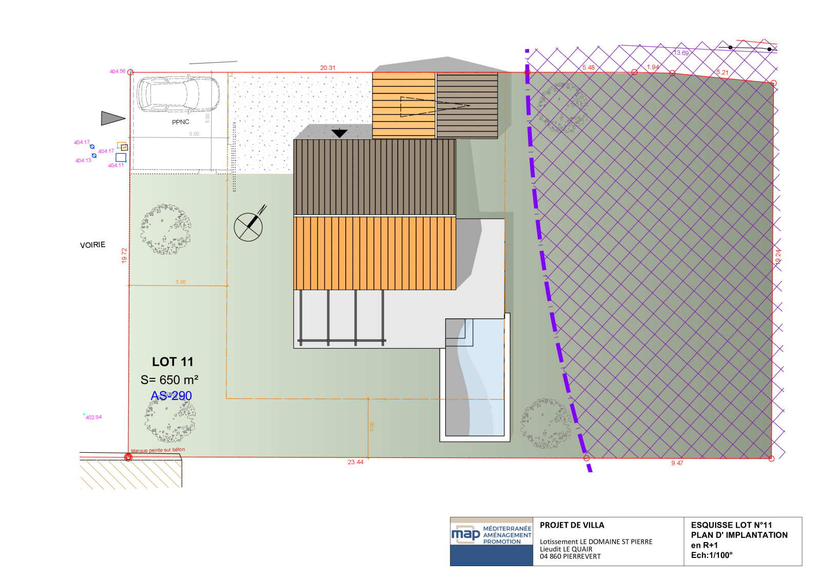 Découvrez le plan de vente du terrain accompagné de deux esquisses soit pour un projet de construction de plain-pied soit à étage dessinées par un architecte en fonction de la réglementation du lotissement, afin de vous permettre de faire chiffrer rapidement chez le Constructeur de votre choix !